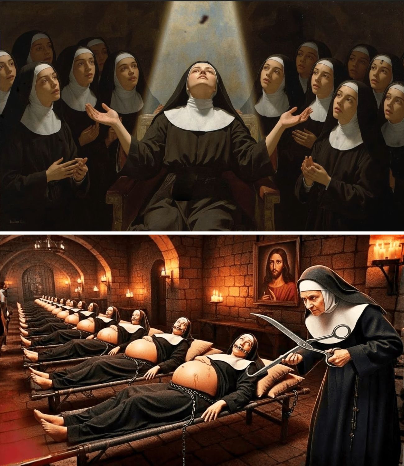 Sabemos apenas que alguns Freiras no verão de 1858 Sinais de gravidez começou a aparecer. Uma declaração de testemunha que coletados durante o processo, mas nunca foi publicado, conta: “Você nos disse que éramos ferramentas do vontade divina, que sob lançamento Virtude e dúvida são pecado. Como ele mesmo nossos corpos começaram a mudar, Eles nos disseram que eram místicos Provações, sinais do céu Escolha.
