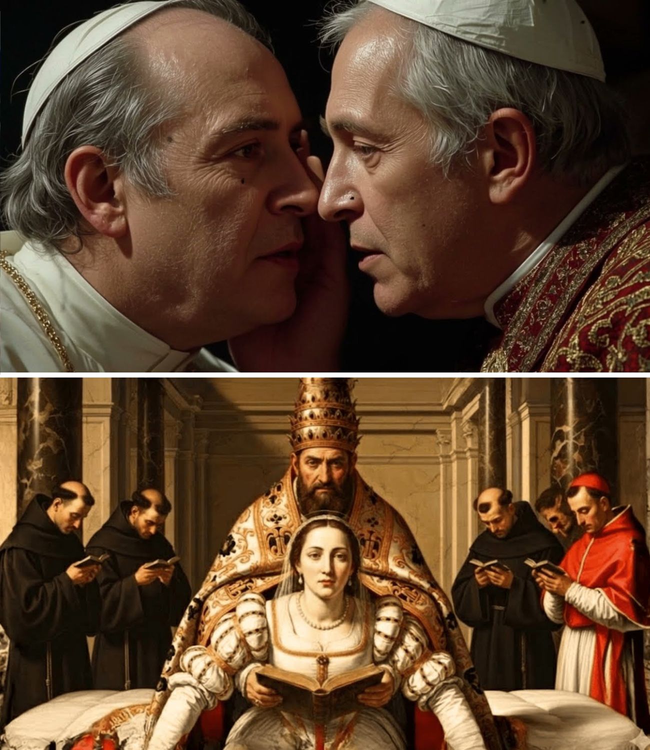 Cardeais viraram os seus Desviaram o olhar, benzeram-se, murmuraram Orações. Alguns tentaram se levantar e fechar vá, mas os guardas nas portas deixou inequivocamente claro que ninguém saía da sala. Alfonso olhou para isso sem acreditar Atuando, seu rosto é uma máscara Horror e descrença. Lucretia sentou-se como se estivesse petrificada.