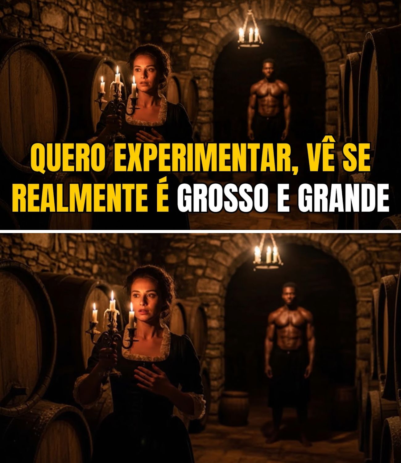 Quando o tecido caiu, o silêncio na cave tornou-se absoluto, cortado apenas pela respiração curta da aristocrata. Os olhos de Bruna arregalaram-se, os rumores de Alessandra, as queixas da Adriana, nada a preparara para a realidade. O apelido madeira grossa não era uma metáfora ou um exagero de cenzala, era uma descrição literal e imponente.
