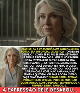 Às 6 da manhã, batida sacudiram a minha porta. Um oficial de justiça estava na minha varanda segurando papéis. Ordem de despejo. O meu nome estava impresso como se eu fosse uma estranha na minha própria casa. O meu filho e a minha nora estavam do outro lado da rua, observando, quietos, satisfeitos. Minha nora gritou: “Devias ter feito o que a família pediu?” O meu filho disse: “Deve sair da casa hoje?” Não, amanhã, não, para a semana, agora.